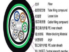 GYTA53光缆的结构是将250μm光纤套入高模量材料制成的松套管中,松套管内填充防水化合物。缆芯的中心是一根金属加强芯,对于某些芯数的光缆来说,金属加强芯外还需挤上一层聚乙烯(PE)。松套管(和填充绳)围绕中心加强芯绞合成紧凑和圆形的缆芯,缆芯内的缝隙充以阻水填充物。涂塑铝带(APL)纵包后挤一层聚乙烯内护套,双面涂塑钢带(PSP)纵包后挤制聚乙烯护套成缆